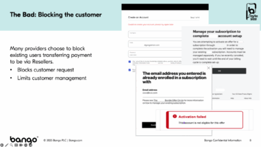 Graeme discussed during the webinar how Bango expertise significantly improved the customer experience activation flow for one of our partners. Initially, the partner faced challenges with a cumbersome migration process that involved multiple steps and confusing error messages. Customers would start at the reseller’s site, find an attractive offer, and then be redirected to the content provider’s page. However, this journey was fraught with obstacles, including unnecessary redirections and error messages that left customers feeling frustrated and confused.