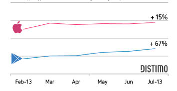Distimo - Top Global Apps July 2013 Everyone likes a success story, so the recent stats from our friends at Distimo revealing that “Google Play revenues surged by 67% during the last 6 months” was most welcome. Especially since Bango connects operator’s billing systems into Google Play, allowing subscribers to pay for apps and content using their mobile phone bill. Apple in the same period, according to Distimo, grew by a very respectable 15% showing how consumers are increasingly prepared to pay for quality apps and content. It shows that smartphone uptake is increasing within high penetration markets such as the USA and Europe while entering new markets such as Russia.