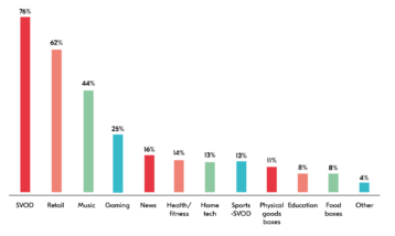 The average subscriber now has 4.5 subscriptions, while 10% have 10+ and 2% have 15+. Currently, 62% of US subscribers have a retail subscription, 25% have a gaming subscription, 16% have a news subscription, while 13% have a home tech subscription.